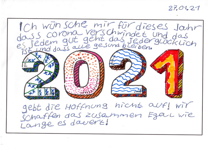 Die Klasse 5c befasste sich im Kunstunterricht mit dem Thema „Muster“. Die Aufgabe war, die Zahl 2021 mit selbstgewählten Mustern zu gestalten und zusätzlich die eigenen Wünsche für das Jahr 2021 um die Zahlen herum aufzuschreiben.